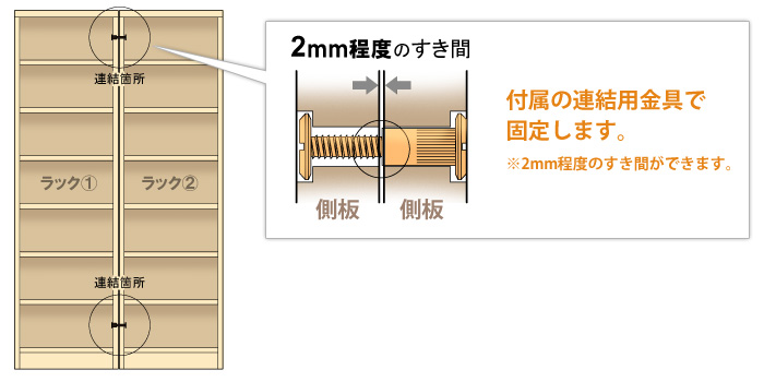 付属の専用金具で固定します。ラックとラックの間は2mm程度すき間ができます。