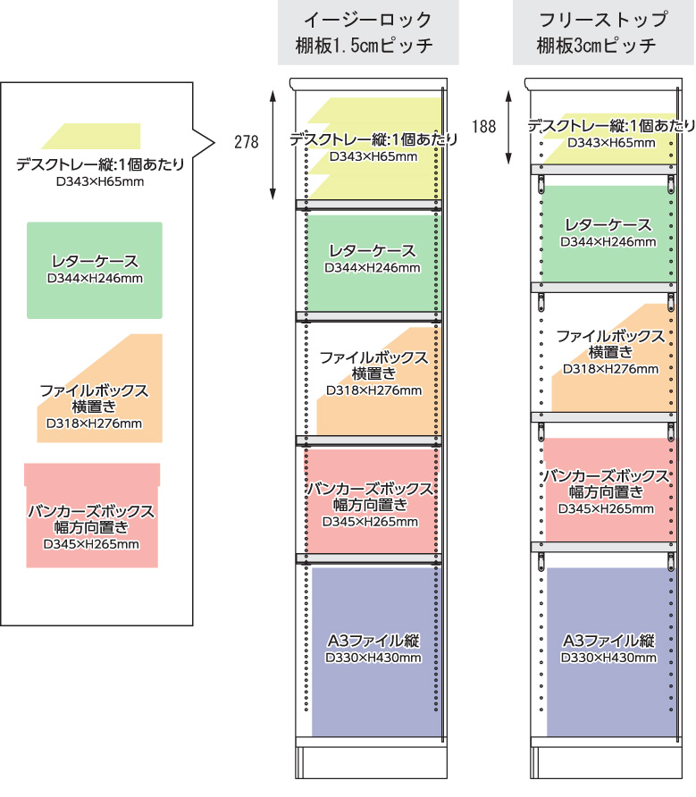 奥行40cmの収納例(左:イージーロック棚受、右:フリーストップ棚受)